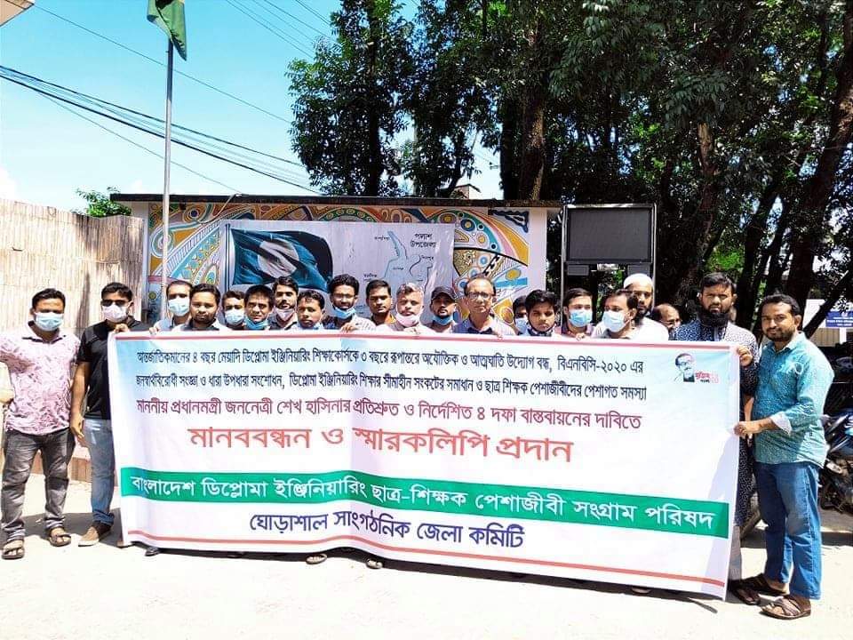 বাংলাদেশ ডিপ্লোমা ইঞ্জিনিয়ারিং ছাত্র-শিক্ষক পেশাজীবী সংগ্রাম পরিষদ কেন্দ্রীয় কমিটি ঘোষিত ৪ দফা দাবি বাস্তবায়নের লক্ষ্যে সারাদেশের ন্যায় ঘোড়াশালে পালিত হয়েছে মানববন্ধন।