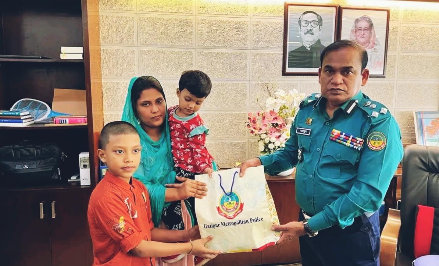 কর্তব্যরত অবস্থায় সড়ক দুর্ঘটনায় নিহত পুলিশ সদস্যের পরিবারের হাতে পেনশন ও ছুটি নগদায়ন (লাম্পগ্রান্ট) এর অর্থ তুলে দিলেন জিএমপি কমিশনার মহোদয় জিএমপি কমিশনার জনাব মাহবুব আলম, বিপিএম, পিপিএম (বার) মহোদয় ১০ ডিসেম্বর ২০২৩ রবিবার কর্তব্যরত অবস্থায় সড়ক দুর্ঘটনায় নিহত পুলিশ সদস্য বিতান বড়ুয়া'র পরিবারের হাতে পেনশন ও ছুটি নগদায়নের (লাম্পগ্রান্টে) অর্থ তুলে দেন। দ্রুতসময়ে পেনশন ও ছুটি নগদায়নের (লাম্প-গ্রান্ট) অর্থ পাওয়ায় মৃত পুলিশ সদস্যের স্ত্রী ও সন্তানগণ কমিশনার মহোদয়ে'র প্রতি ধন্যবাদ ও কৃতজ্ঞতা জ্ঞাপন করেন। যেকোন প্রয়োজনে জিএমপি'র সাথে যোগাযোগ করার জন্য সম্মানিত কমিশনার মৃত পুলিশ সদস্যের পরিবারের প্রতি আহবান জানান।