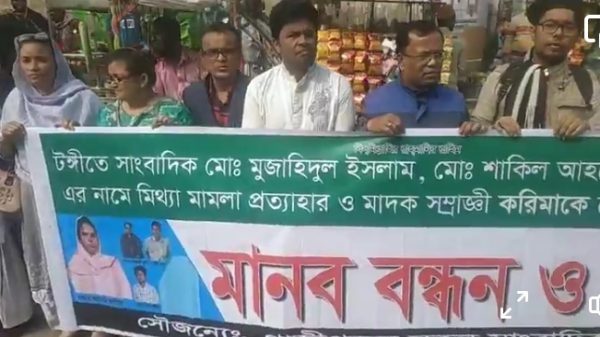 টঙ্গীতে সাংবাদিকের নামে মিথ্যা মামলা প্রত্যাহার এবং মাদক সম্রাজ্ঞী কারিমাকে গ্রেফতারের দাবিতে মানব বন্ধন ও র্যালী অনুষ্ঠিত হয়।