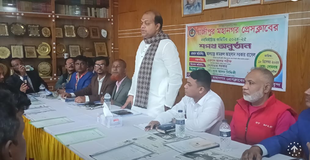 গাজীপুর মহানগর প্রেসক্লাবের ২০২৪- ২৫ সালের নবনির্বাচিত কার্যনির্বাহী কমিটির শপথ গ্রহণ অনুষ্ঠান সকাল ১১ টায় গাজীপুর মহানগরের চান্দনা চৌরাস্তা শামসুদ্দিন সরকারের বাসভবনে অনুষ্ঠিত হয়। এসময় গাজীপুর মহানগর প্রেসক্লাবের প্রধান নির্বাচন কমিশনার এরশাদ আলোর শরীফের সভাপতিত্বে, প্রধান অতিথি হিসেবে বক্তব্য রাখেন ও শপথ গ্রহণ করান, গাজীপুর মহানগর প্রেসক্লাবের প্রধান উপদেষ্ট, গাজীপুর মহানগর আওয়ামী যুবলীগের আহবায়ক মোঃ কামরুল আহসান সরকার রাসেল, বিশেষ অতিথি হিসেবে বক্তব্য রাখেন নির্বাচন কমিশনার দেলোয়ার সরকার, দৈনিক বাংলা ভূমি পত্রিকার সম্পাদক ও প্রকাশক নজরুল ইসলাম আজহার, টঙ্গী প্রেসক্লাবর সেক্রেটারি কালিমুল্লাহ ইকবাল, সাংবাদিক শহিদুল ইসলাম, বাসন মেট্রো থানা প্রেসক্লাবের সভাপতি, কাজল খান, সেক্রেটারি শামীম আহমেদ, সিনিয়র সাংবাদিক তানভীর হোসাইন প্রমুখ।