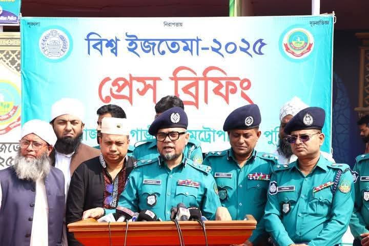 অদ্য ১৩ ফেব্রুয়ারি ২০২৫ খ্রিঃ মাওলানা সাদ পন্থীদের আয়োজনে বিশ্ব ইজতেমা ২০২৫ উপলক্ষে গাজীপুর মেট্রোপলিটন পুলিশের সম্মানিত পুলিশ কমিশনার ড.মোঃ নাজমুল করিম খান পুলিশী নিরাপত্তা ব্যবস্থা এবং ইজতেমা সংশ্লিষ্ট সার্বিক বিষয়াদি সম্পর্কে ইলেকট্রনিক ও প্রিন্ট মিডিয়ার সাংবাদিকবৃন্দকে প্রেস ব্রিফিং এর মাধ্যমে অবহিত করেন। তিনি বিশ্ব ইজতেমা ২০২৫ চলমান পর্বের সার্বিক নিরাপত্তা ও ব্যবস্থাপনা নিয়ে কথা বলেন । পুলিশ কমিশনার আরো জানান, নিরাপত্তা বিষয়ে যথাযথ ব্যবস্থা গ্রহণের জন্য গাজীপুর মেট্রোপলিটন পুলিশ সার্বক্ষণিক তৎপর রয়েছে। ইজতেমা উপলক্ষে সব ধরনের নিরাপত্তা ব্যবস্থা গ্রহণ করা হয়েছে এবং যানবাহন চলাচল স্বাভাবিক রয়েছে।