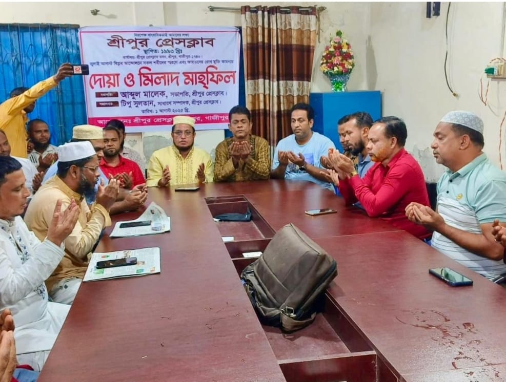 জুলাই আগস্টে শহীদ ও আহতদের স্মরণে দোয়া ও মিলাদ মাহফিলের আয়োজন করে শ্রীপুর প্রেসক্লাব।